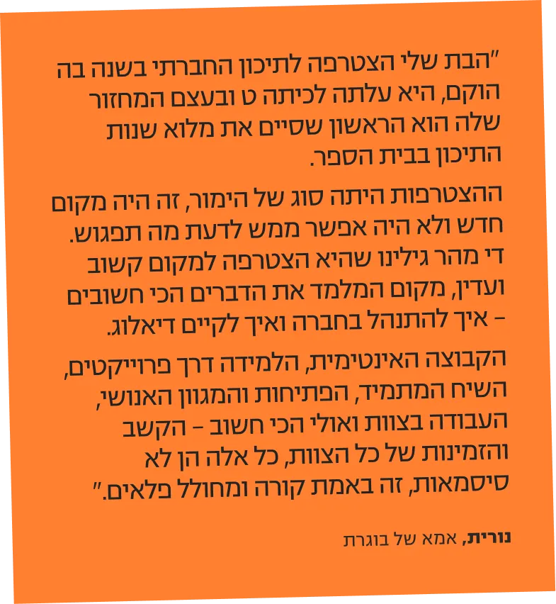 בתיכון החברתי תל אביב - יפו לכל אחד ואחת יש מקום. אצלנו הכיתה היא קבוצה מגובשת המלווה על ידי 2 מחנכות שמקשיבות ורואות כל אחת ואחד
